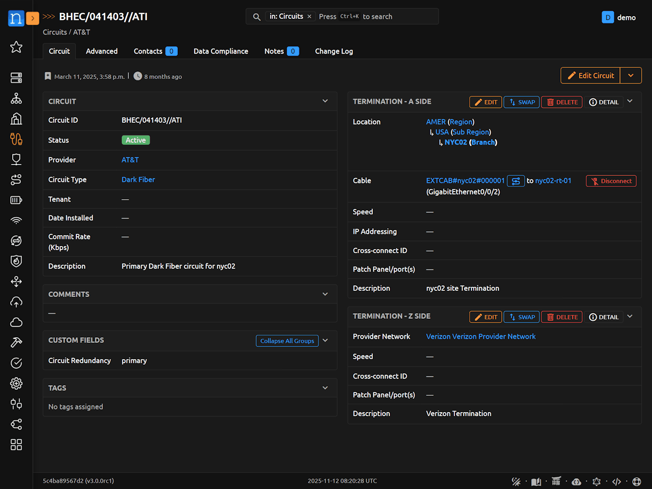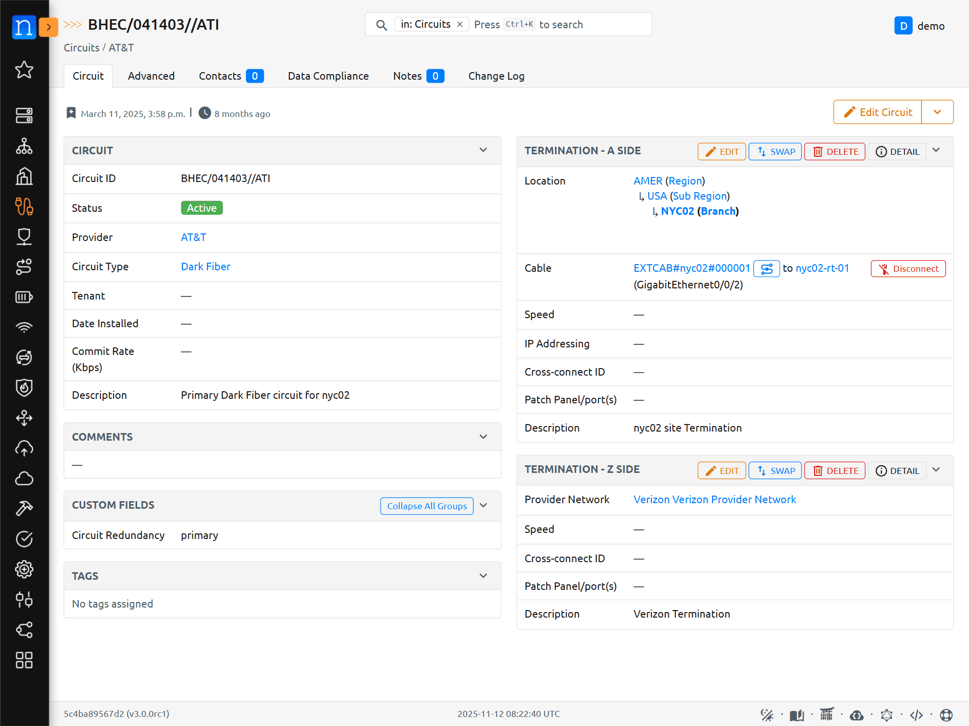 In order to assign contacts/teams to a particular object, we first need to define Status and Role objects for the content type extras:contactassociation. Once that is done, we can navigate to the detail view of the object. We will use a circuit in this example.