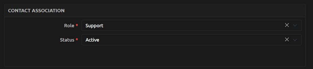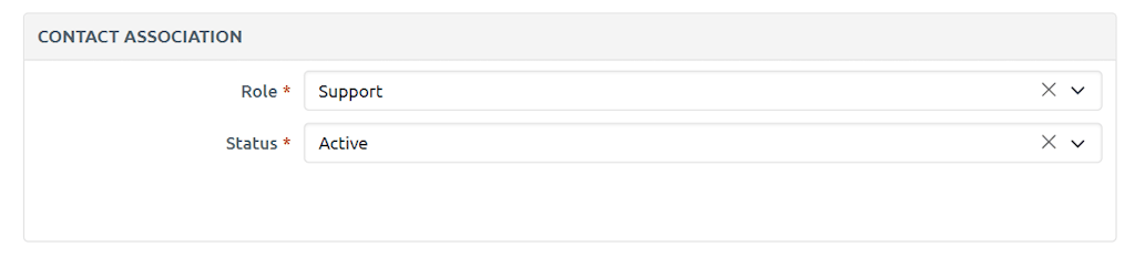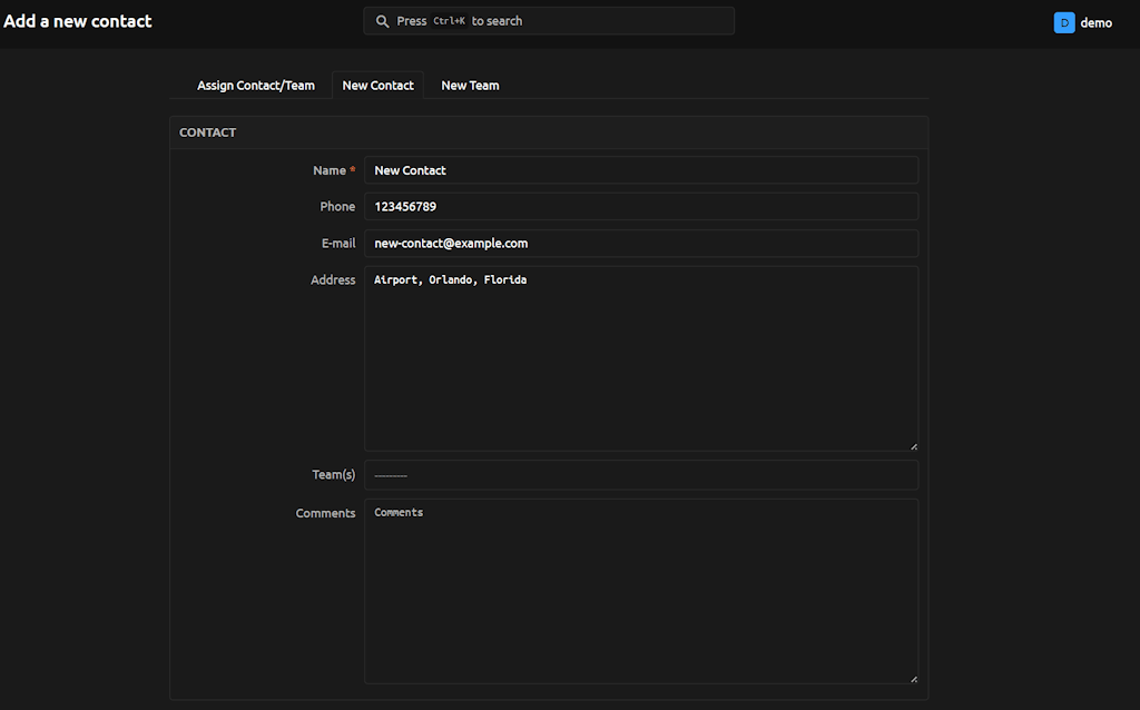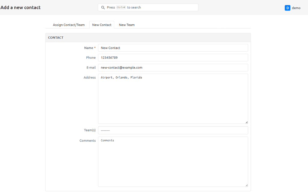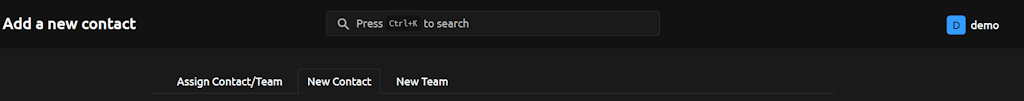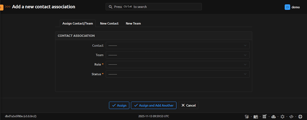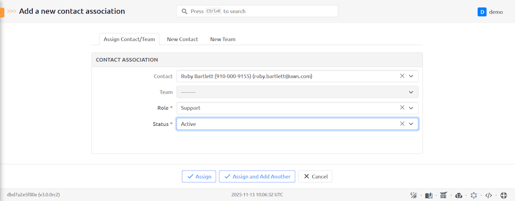- The third tab contains a form that allows the user to select an existing contact or team and associate it with the object.