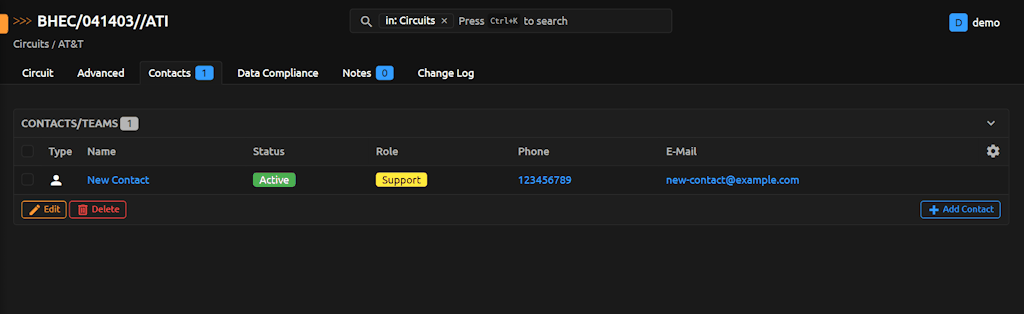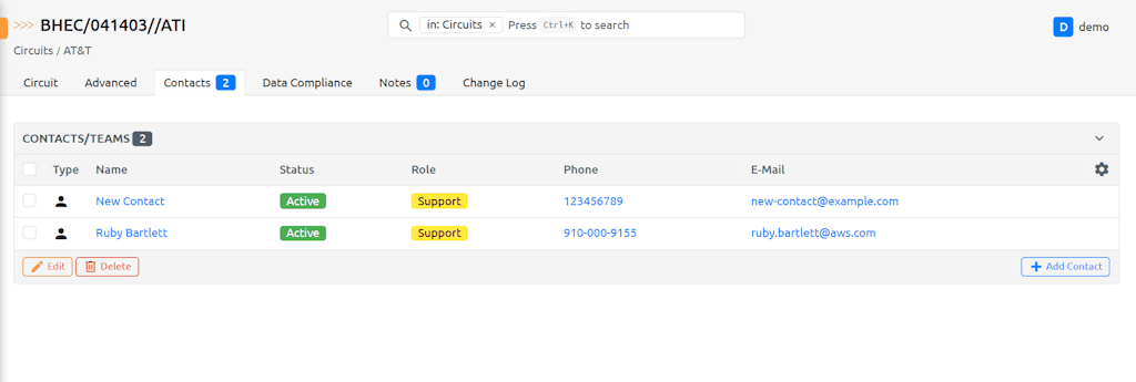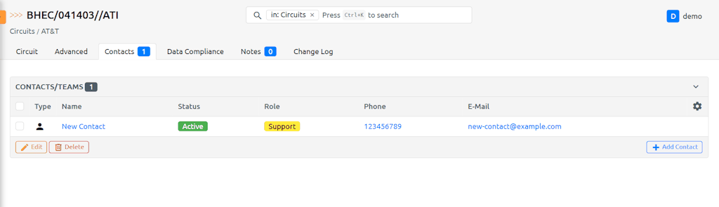 - We can click on the Contacts tab that displays a table of contacts and teams that are associated with this circuit. Our New Contact should be in the table.