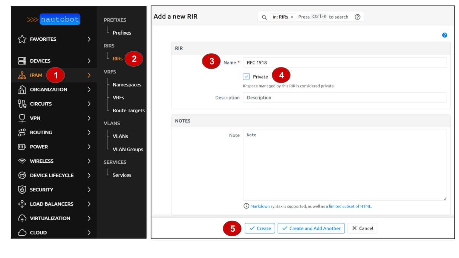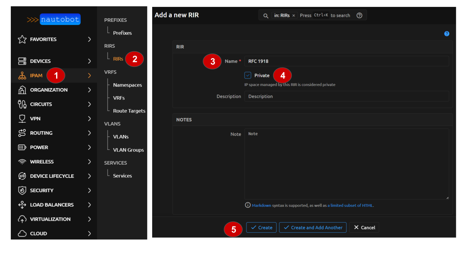A RIR allocates globally-routeable IP address space. There are five top-level RIRs, each responsible for a particular section of the globe. Nautobot also considers RFCs 1918 and 6589 to be RIR-like because they allocate private IP space.