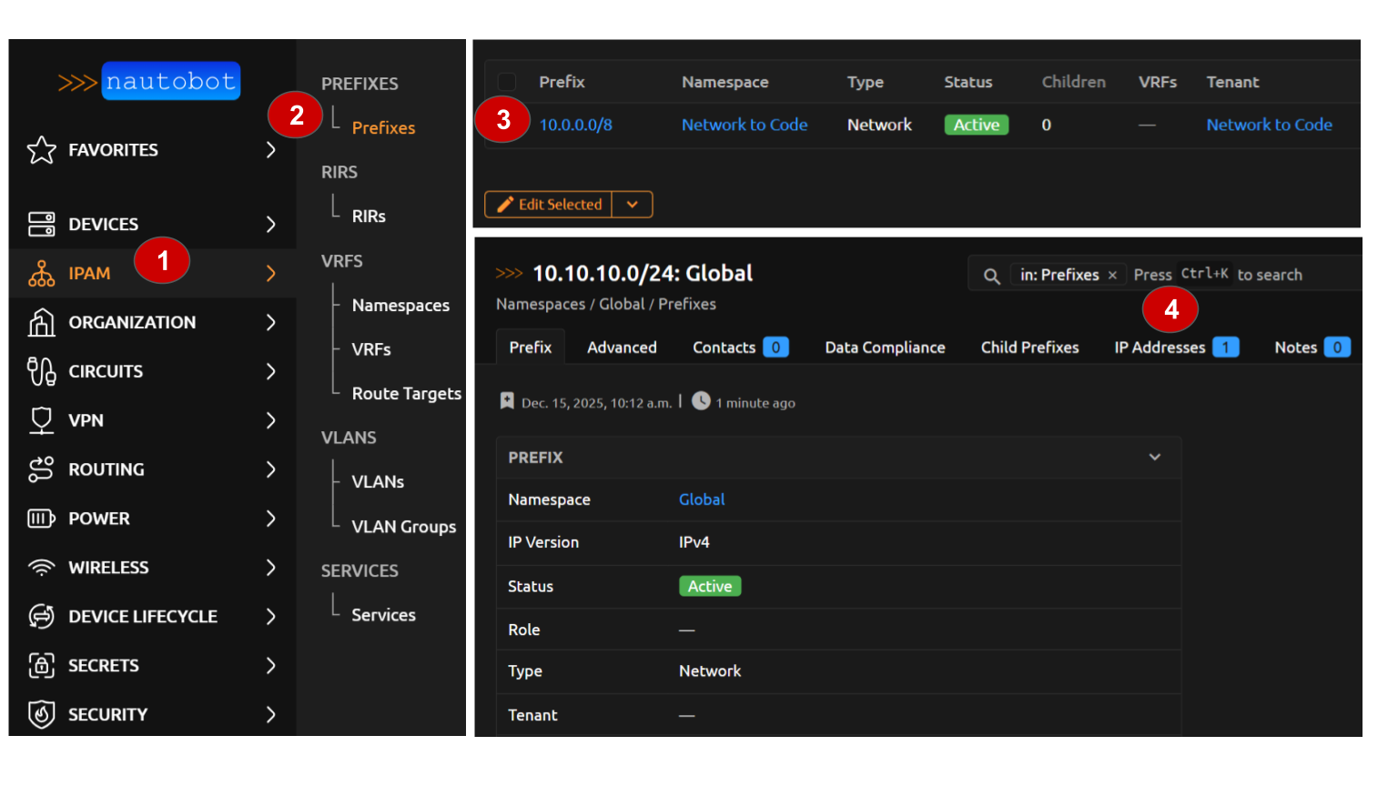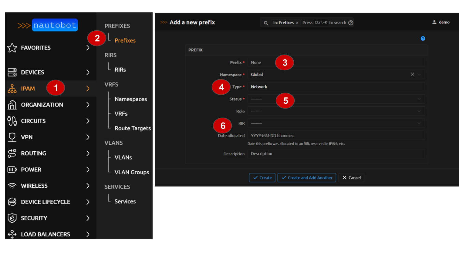 A Prefix is an IPv4 or IPv6 network and mask expressed in CIDR notation (e.g. 192.0.2.0/24). Each Prefix can be assigned to a particular Location, an RIR and virtual routing and forwarding (VRF) instance.