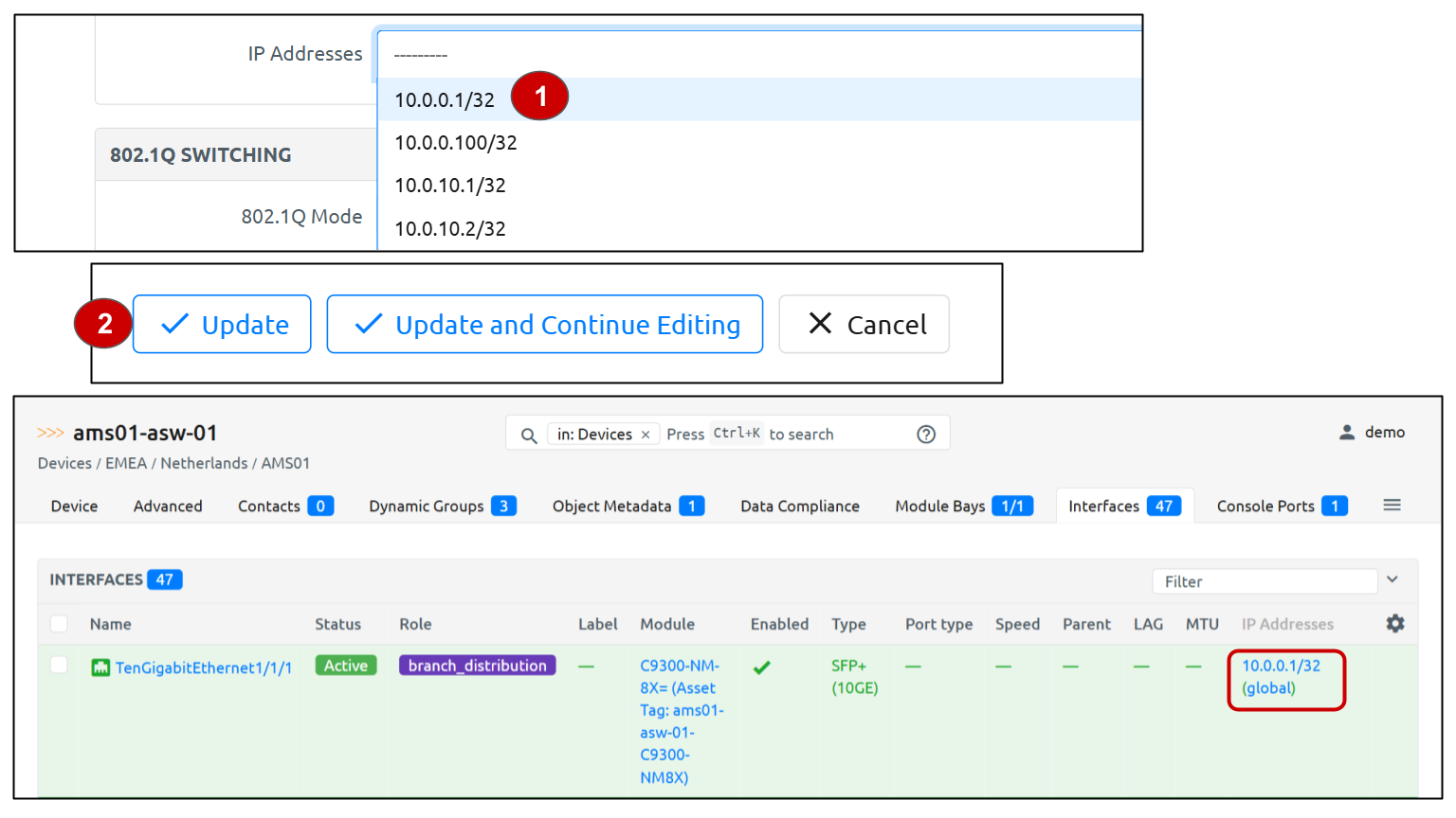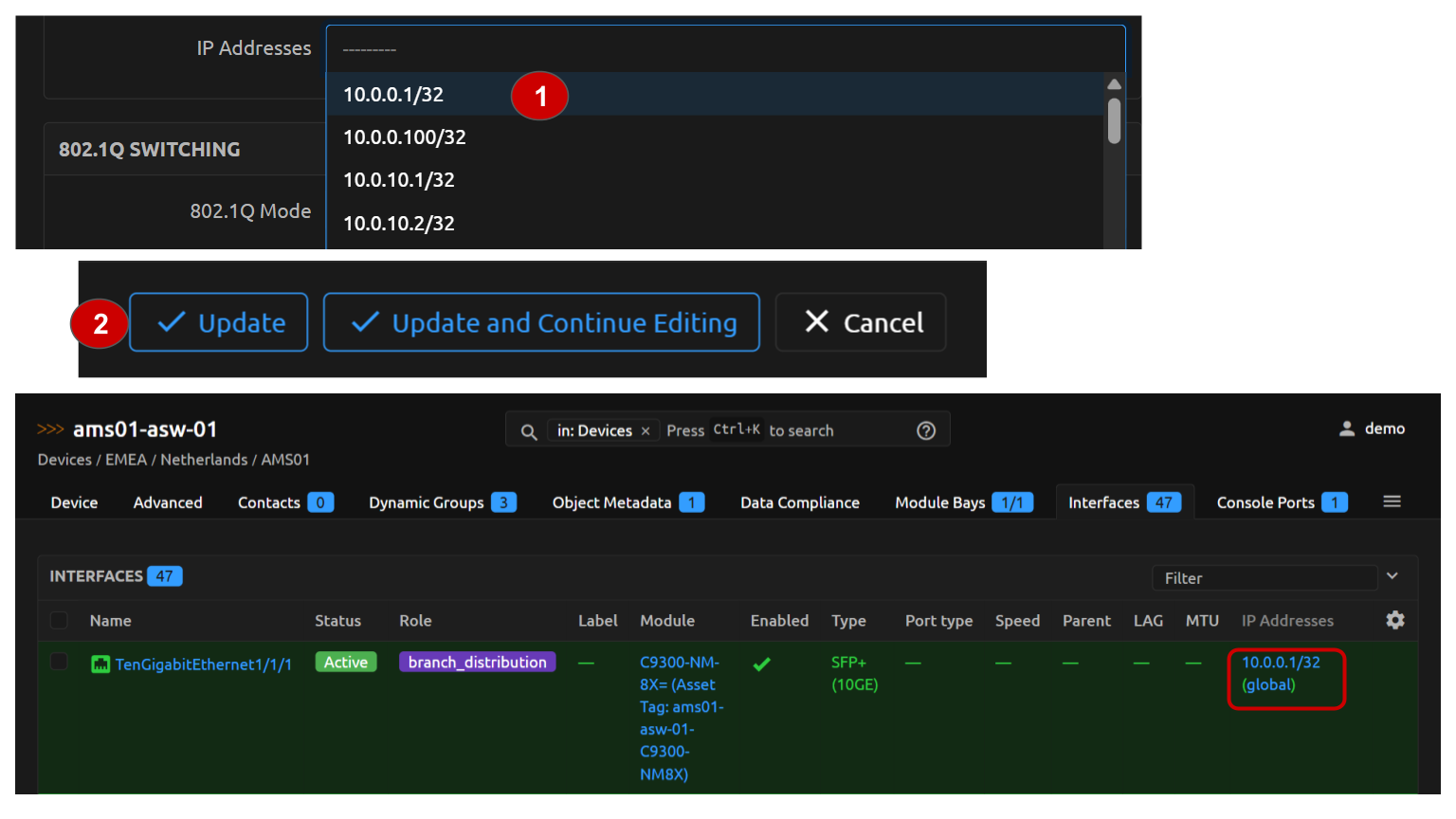Updatebutton- This will take you back to the Interfaces page for the Device, where you will see the assignment shown under the