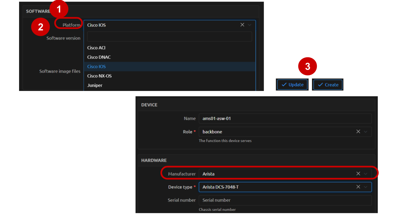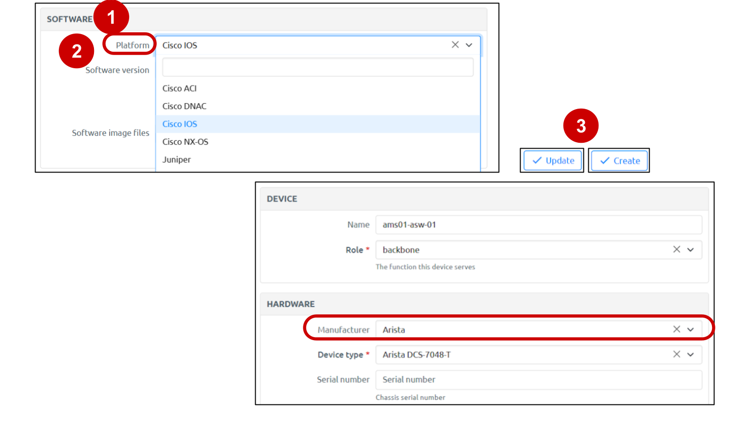 The only choices that will appear in the Platform drop-down selector will be those Platforms that have the same Manufacturer specified in the Device's Hardware section.