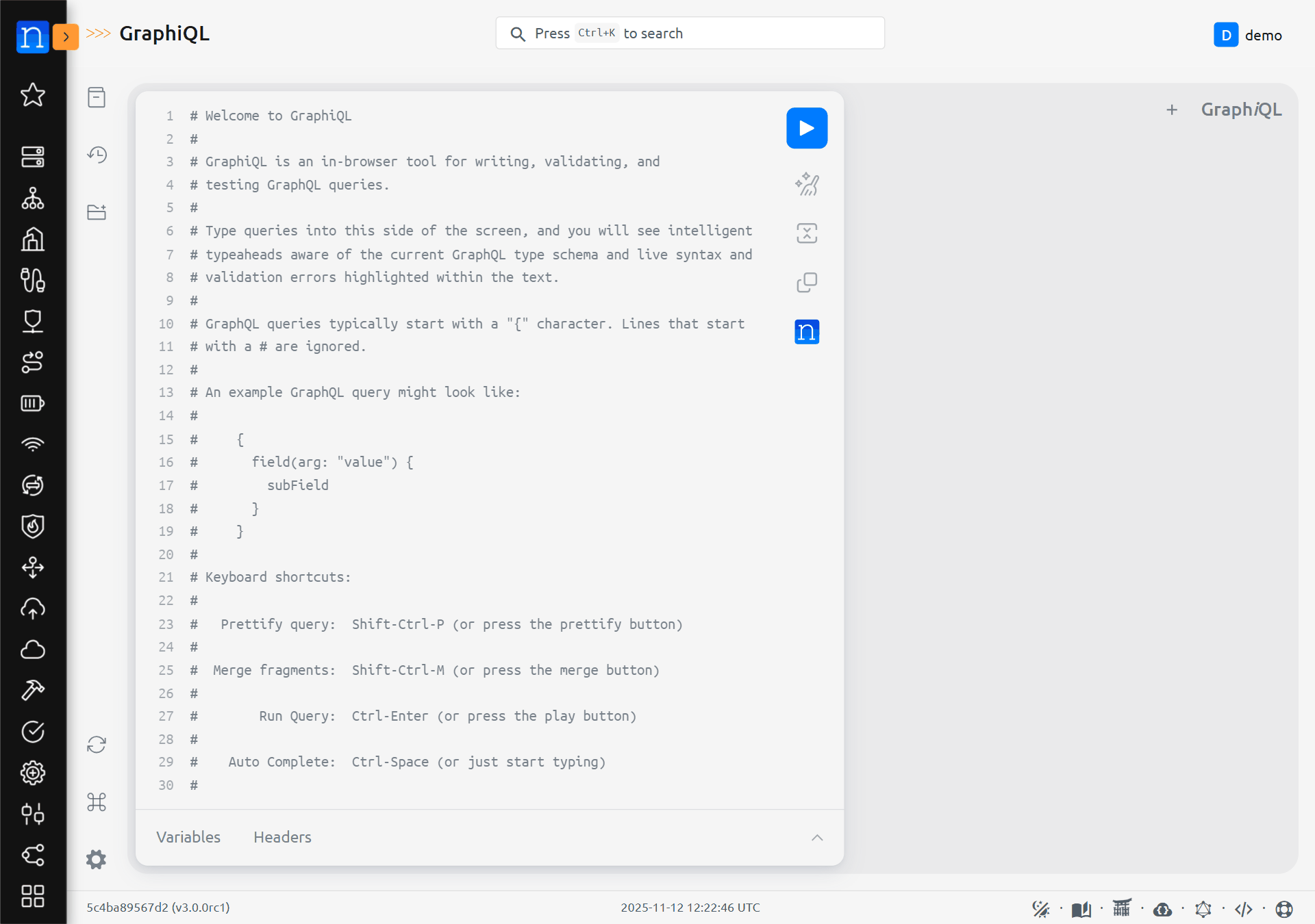 In Nautobot, there is a link to the GraphQL web interface at the bottom right-hand side of the page. The GraphQL web interface is called GraphiQL. Navigating to the URI (/graphql), brings up the GraphiQL tool for creating queries. This interface is useful for exploring the possibilities of GraphQL and validating that written queries execute successfully.