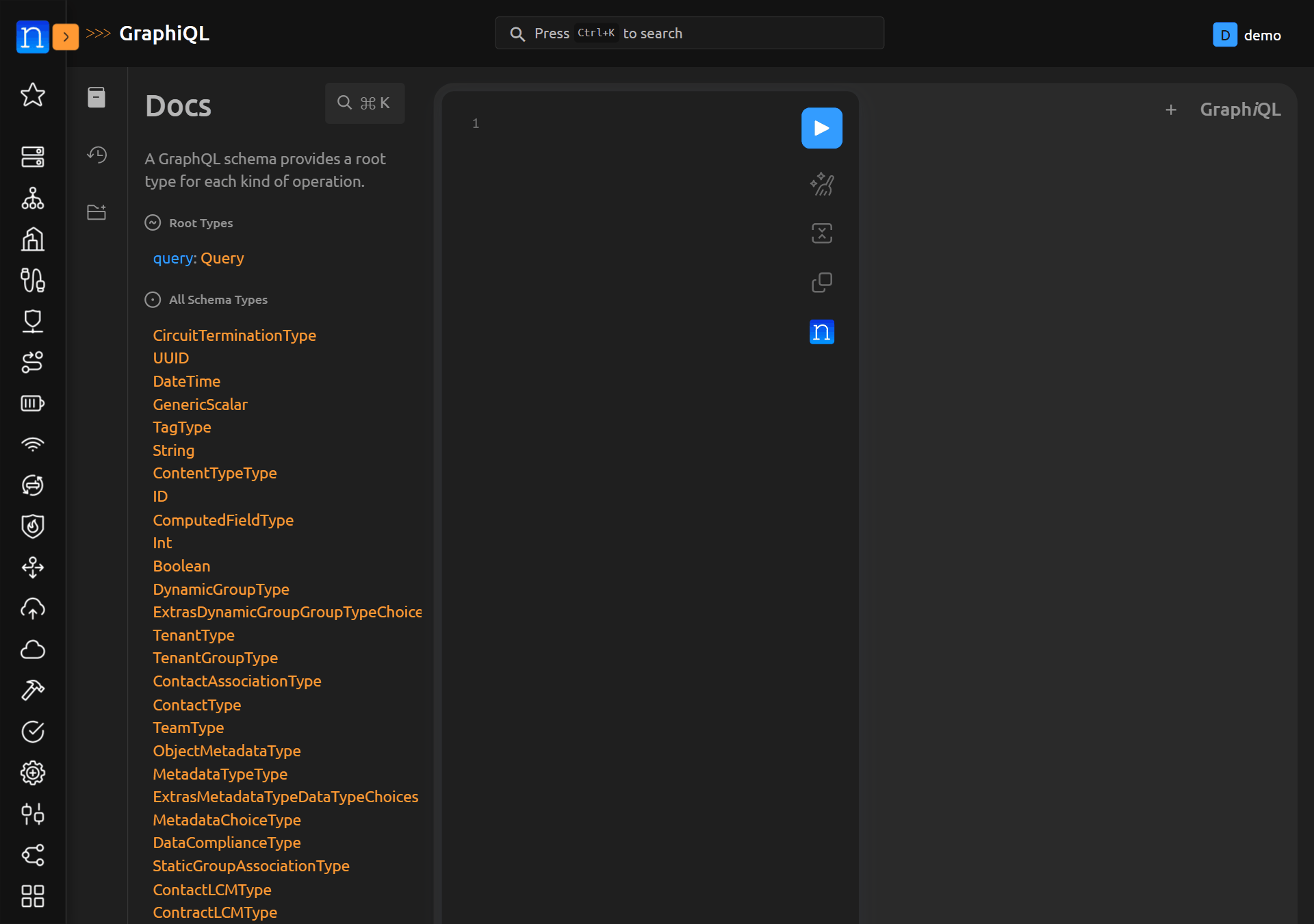 If you're new to GraphQL, take a little bit of time to explore the Documentation Explorer. This can be accomplished by clicking the < Docs link in the GraphiQL interface. The information within Documentation Explorer is specific to creating queries in Nautobot.