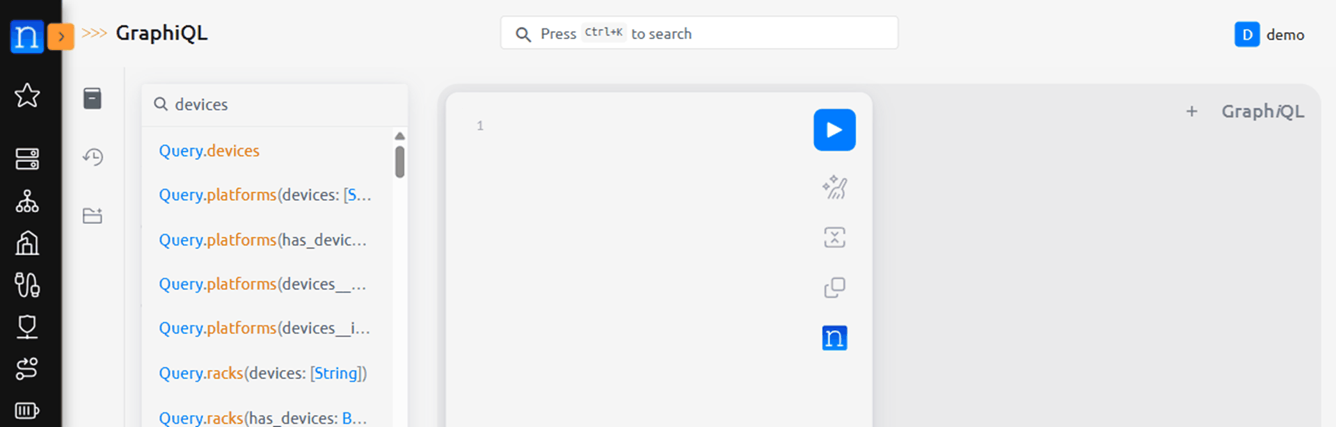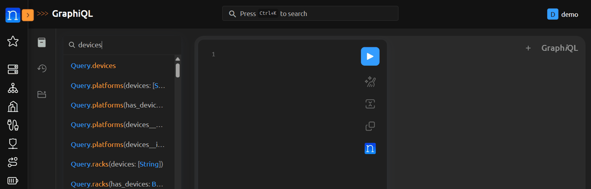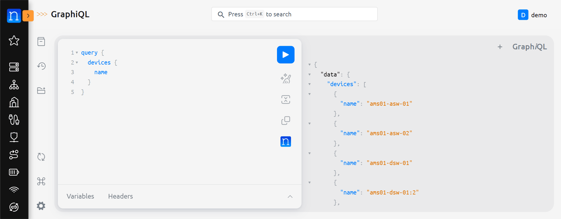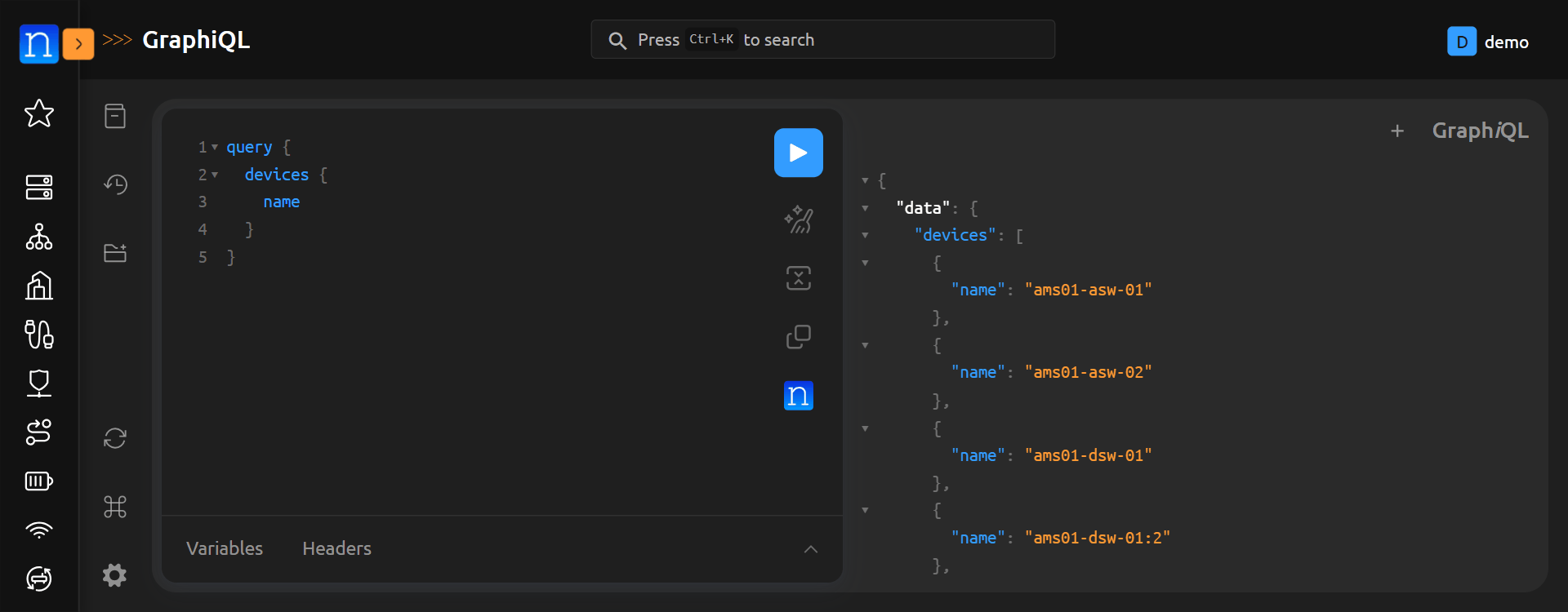 GraphQL queries are encapsulated in query { } flags (simply { } is also acceptable). With that in mind, let's craft our query from the GraphiQL interface to inspect all devices and display their device names. To do this, let's execute: