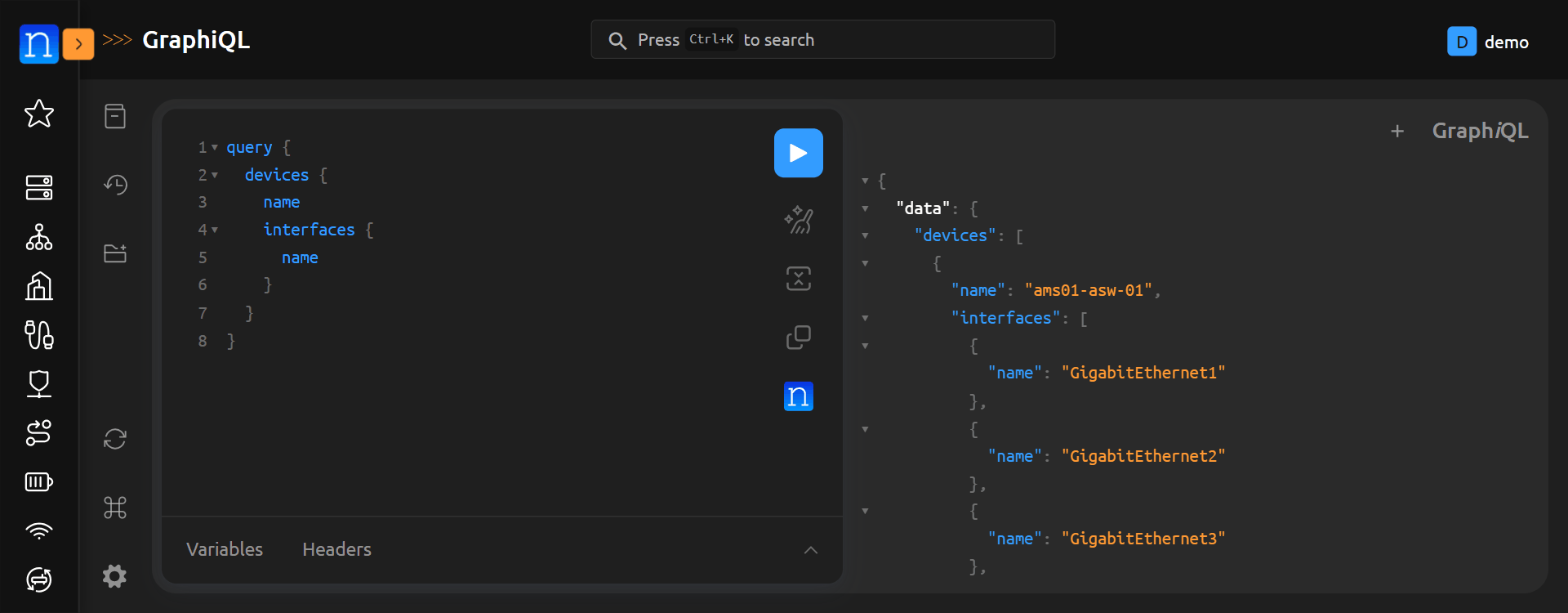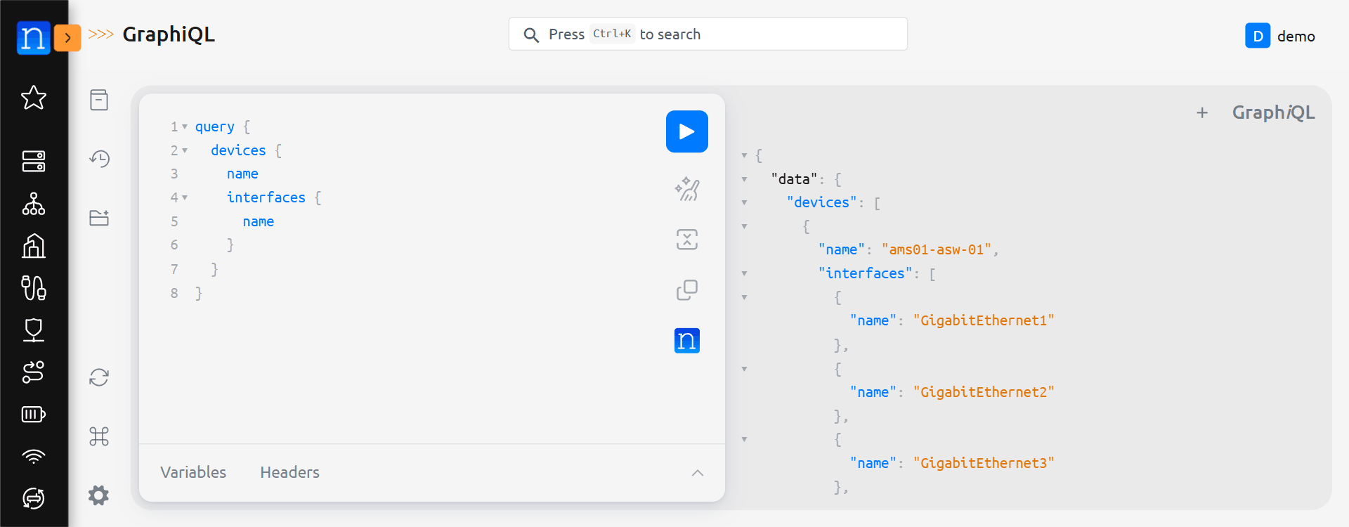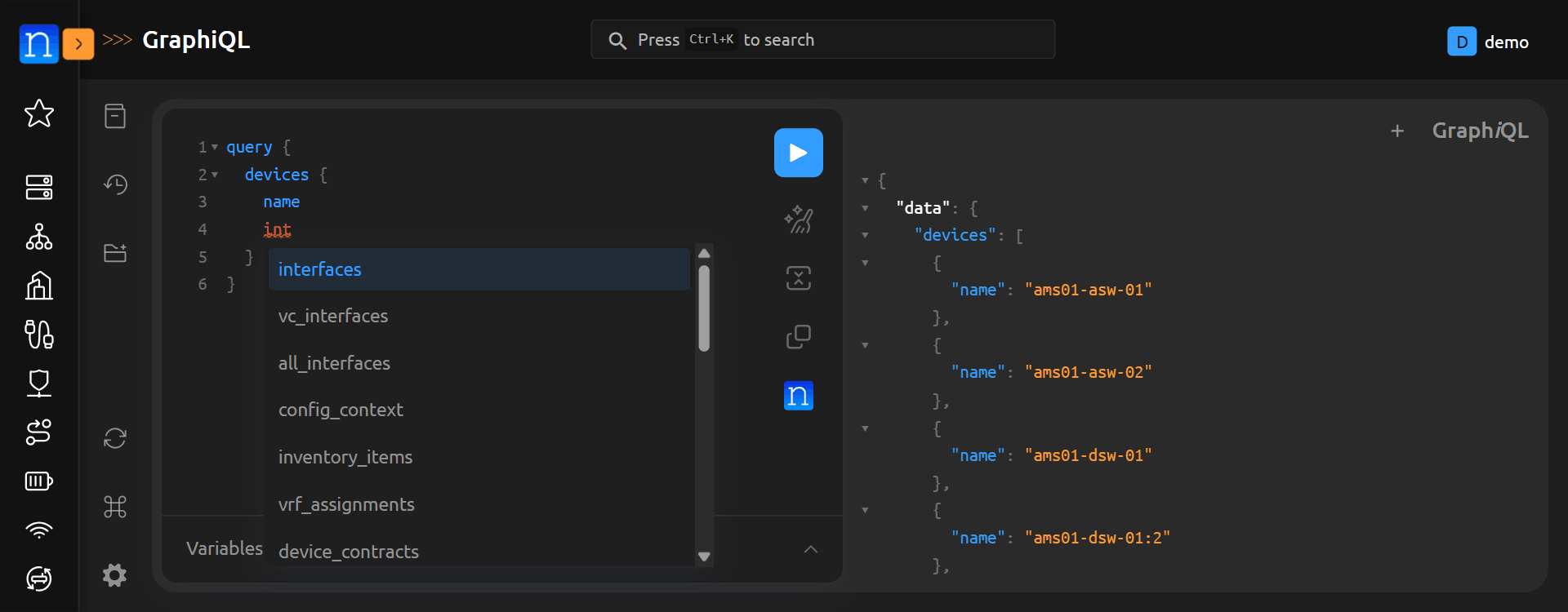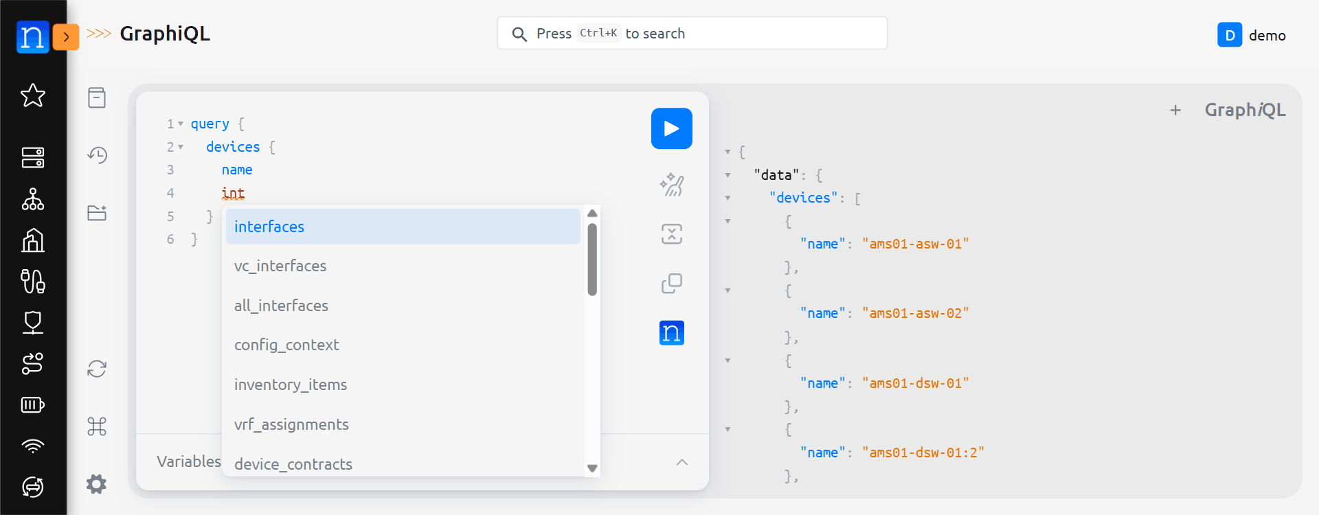 Now, let's modify the query to provide interface names for each device. We can do that by modifying the existing query to add interfaces { name } as a sub-query of devices. GraphiQL makes this process a bit easier, because it has syntax completion built in.