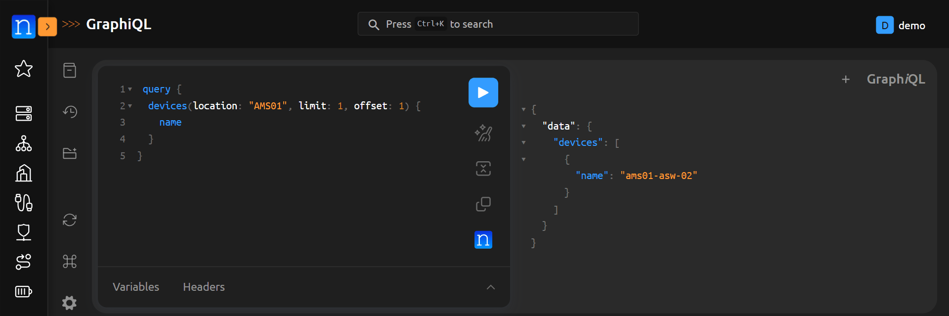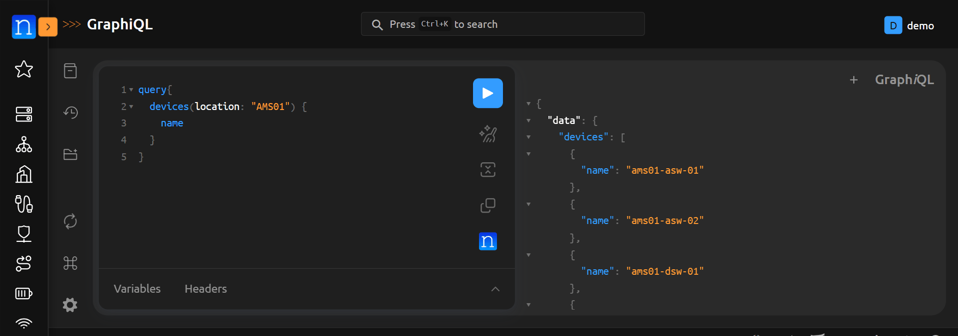 As an example. We can query devices by their location. This is done by adding (location: "<location name>") after devices. For example: query { devices(location: "AMS01") { name }} will display all devices in the AMS01 location.