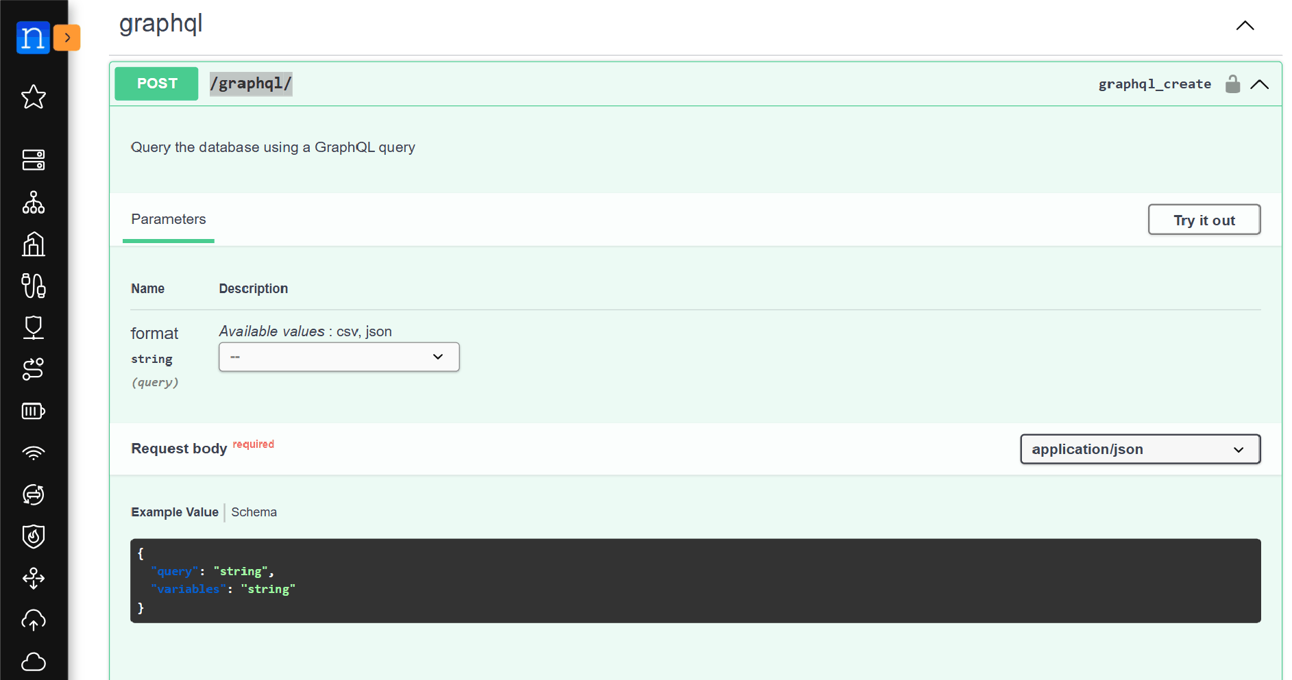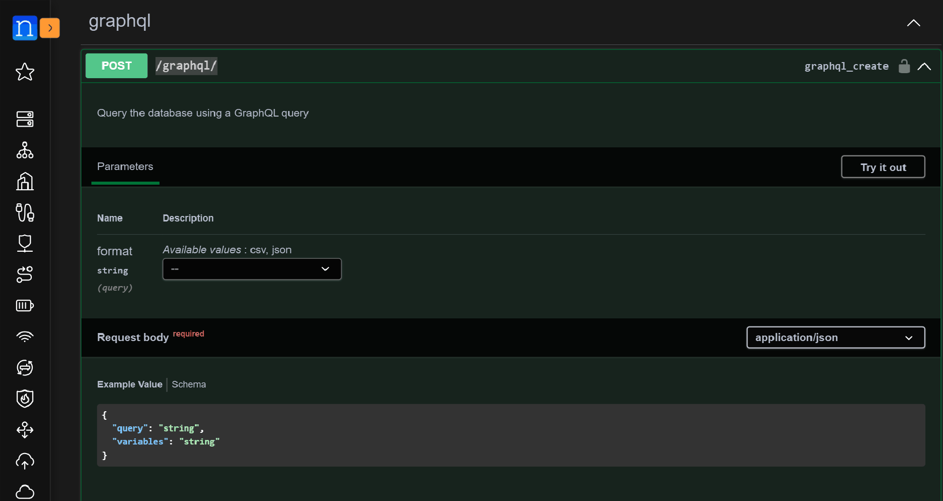 From the Nautobot Swagger documentation, we can see that the API calls to /api/graphql require a HTTP POST method. In the HTTP POST, the query field is required, as it is where we specify the GraphQL query. The variables field is optional; it's where we can assign values to any variables included in the query, if we choose to do so.