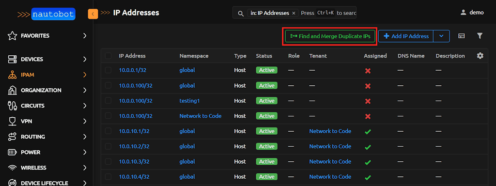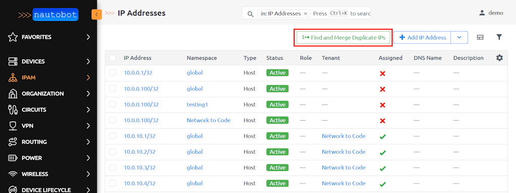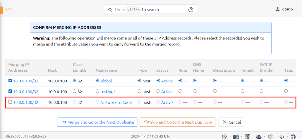 Clicking on the Find and Merge Duplicate IPs button will automatically query your database for duplicate IPAddress objects and group them by their respective host values. The tool will present the duplicate IPAddress objects in order from lowest to highest mask_length values.