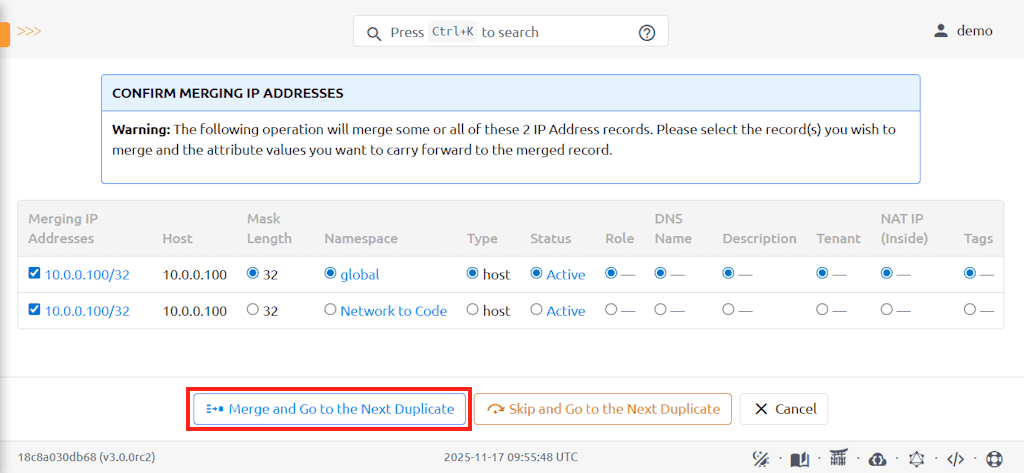 When a set of potentially duplicate IPAddress objects are found, the tool will present them and all of their editable attributes as a table. Select the desired value for each attribute and click on the Merge and Go to the Next Duplicate button. Nautobot will combine all of the selected IPAddress objects into a new IPAddress with the attributes you selected.