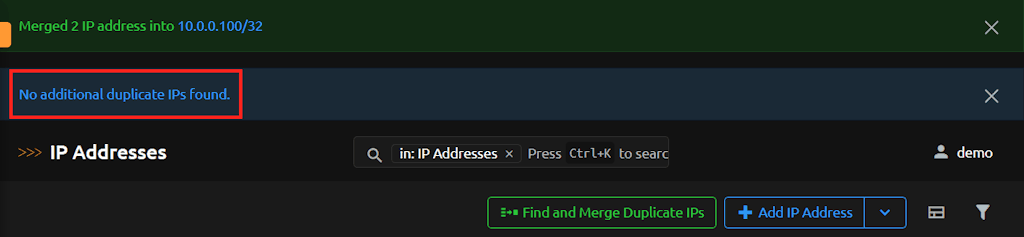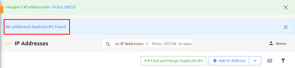 If you have gone through all duplicate IPAddress objects, you will be taken back to the list view of IPAddress objects with a message indicating that No additional duplicate IPs found..