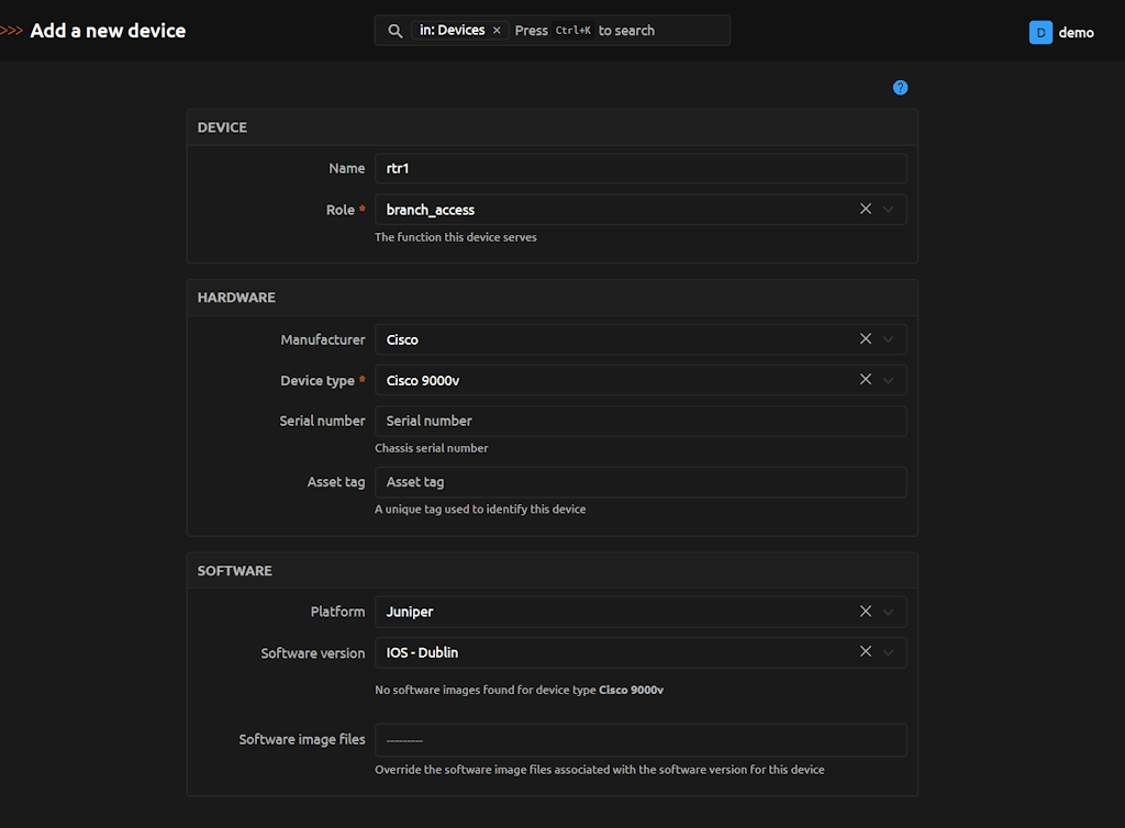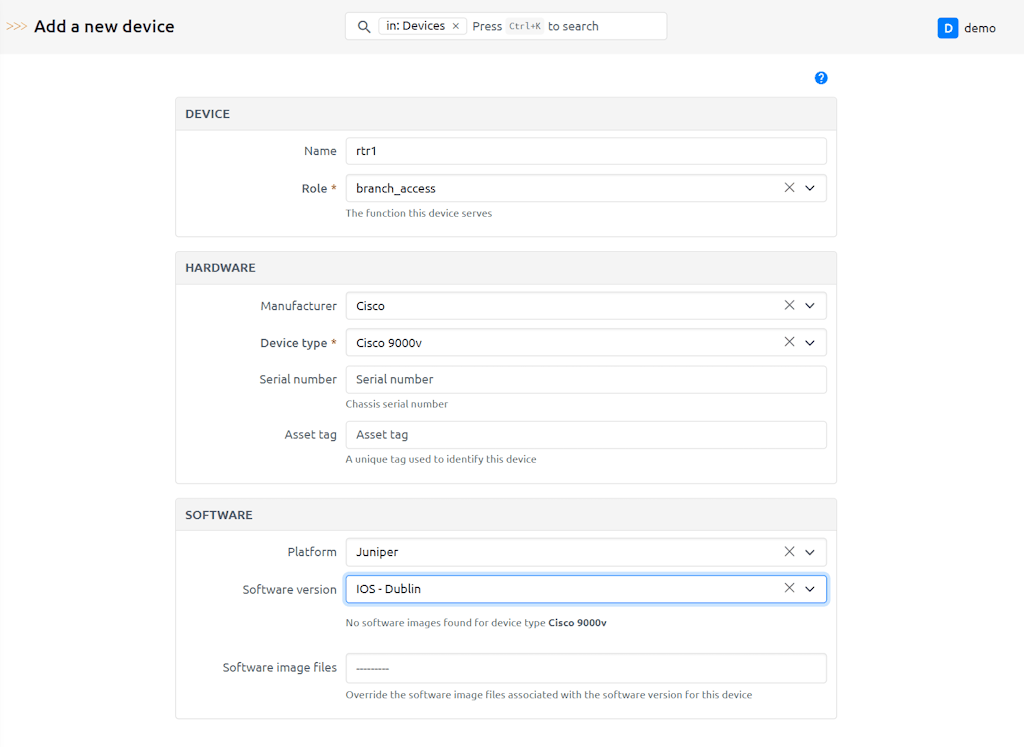 By default, the Software Image Files associated to a Software Version will be inherited by a Device, Inventory Item or Virtual Machine with the same Software Version. However, you can override this behavior by directly associating Software Image File to the Device, Inventory Item or Virtual Machine. This association can be made in the UI on the Device, Inventory Item or Virtual Machine forms. Through the REST API, the Software Image File can be associated on the Device, Inventory Item and Virtual Machine REST API POST/PUT/PATCH views.