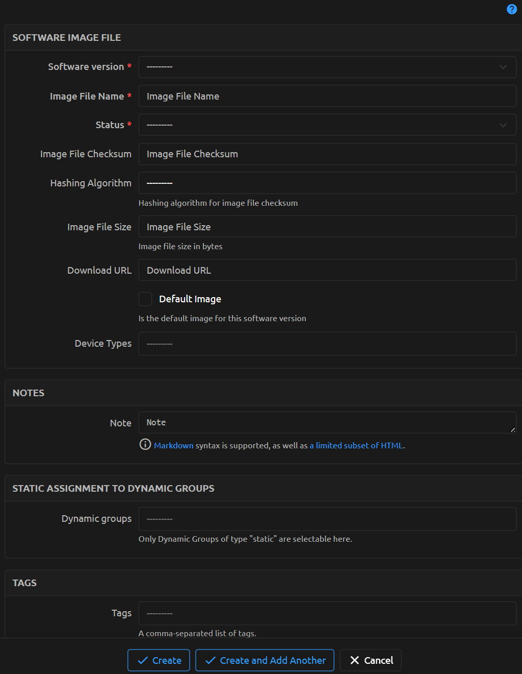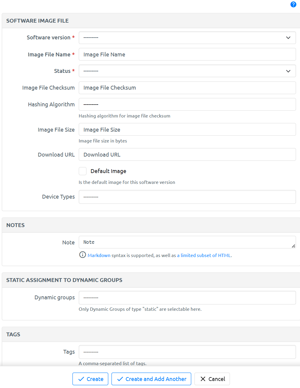 To create a new Software Image File, navigate to Devices > Software Image Files and click Add. (/dcim/software-image-files/add/) The Software Version, Image File Name and Status fields are all required. There are optional fields for Image File Checksum, Hashing Algorithm, Image File Size, Download URL, Default Image, and Device Types.