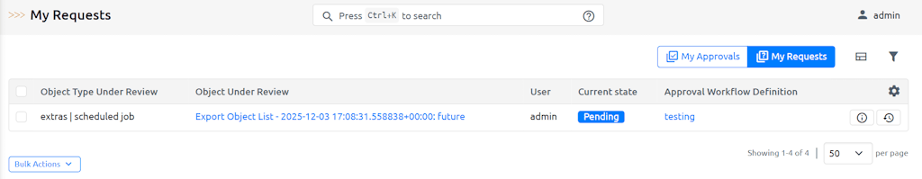 extras.view_approvalworkflow- to view created approval workflows after creating, updating, or running an object.extras.view_approvalworkflowstage- to view the My Requests tab on the Dashboard.extras.view_approvalworkflowstageresponse- to view responses for each stage.