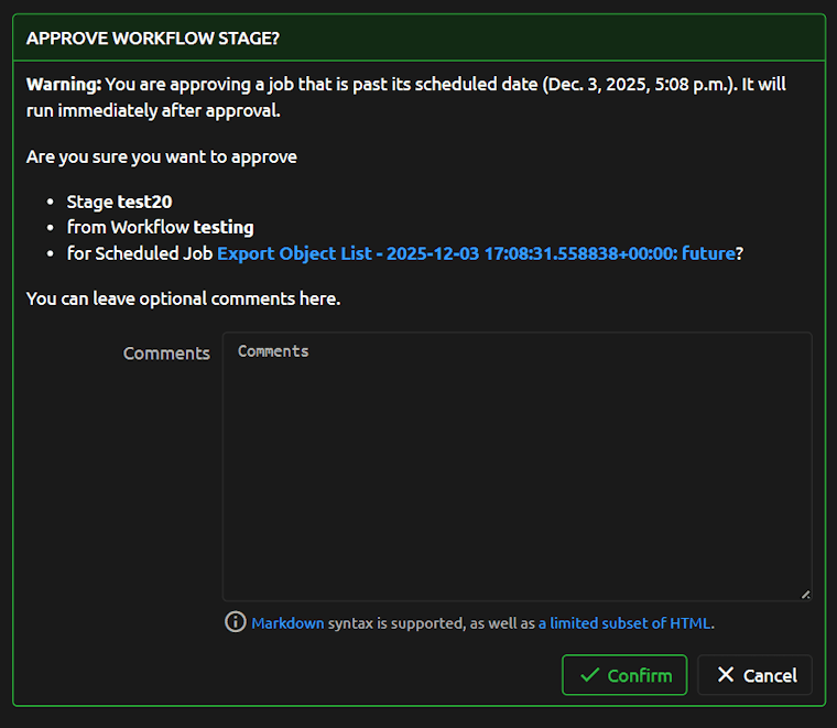 ApprovalWorkflowDefinitionusing constraints such as{"job_model__name__in": ["ExampleDryRunJob", "Example Job of Everything", "Export Object List"]}. See Create an Approval Workflow Definition with stages - However, constraints today are limited to what can be expressed as a single dictionary of field lookups. More complex logic (e.g.,