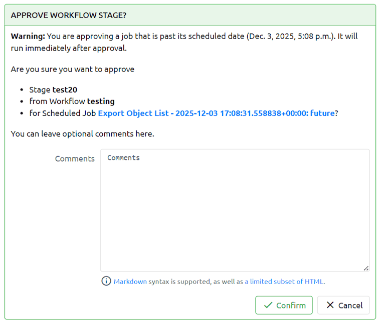 - An Object Operator submits a job for approval. See Running Jobs Via the Web UI or Scheduling via the UI. If an approval workflow definition exists, the approval workflow is created automatically.