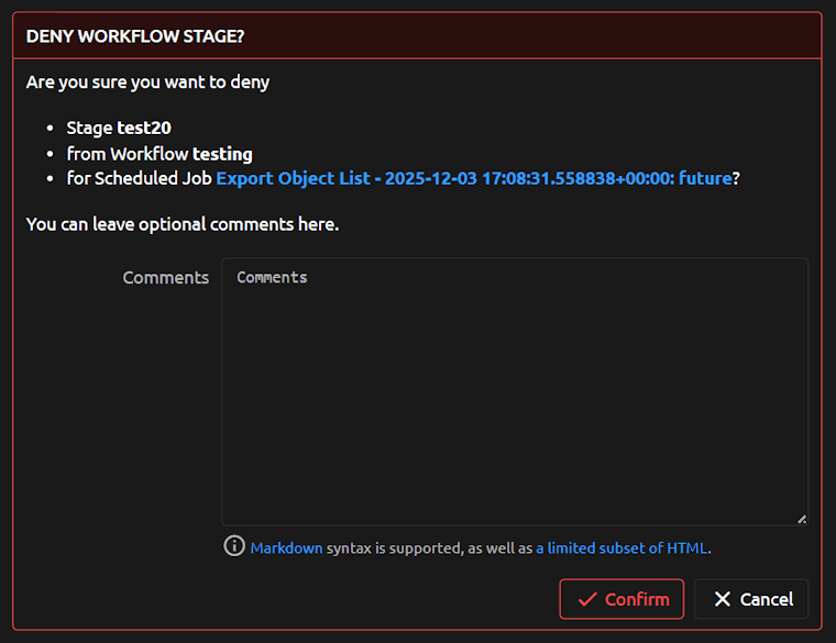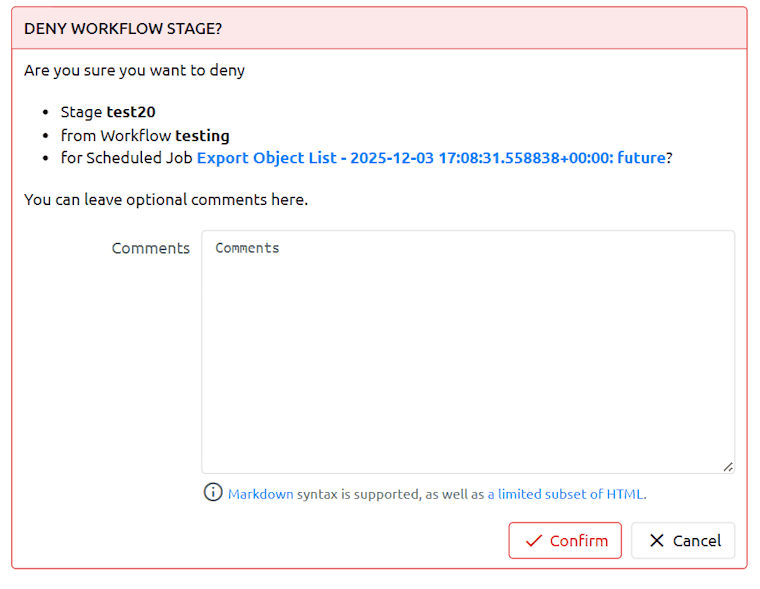 Approval Workflows allows for a multi-stage review and approval of processes before making changes, running or creating specific objects in the system. They are defined in advance and attached to specific models based on certain constraints.