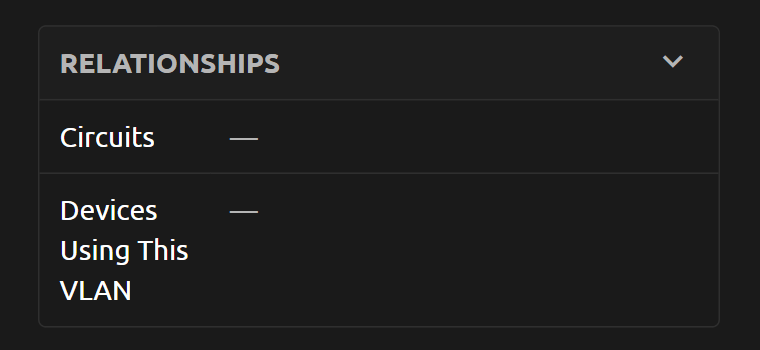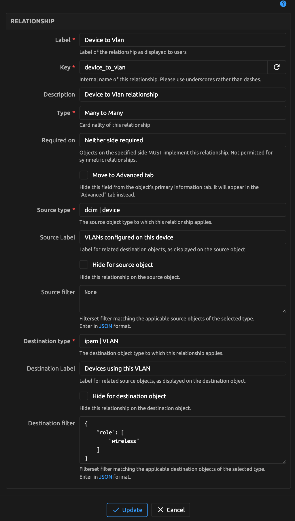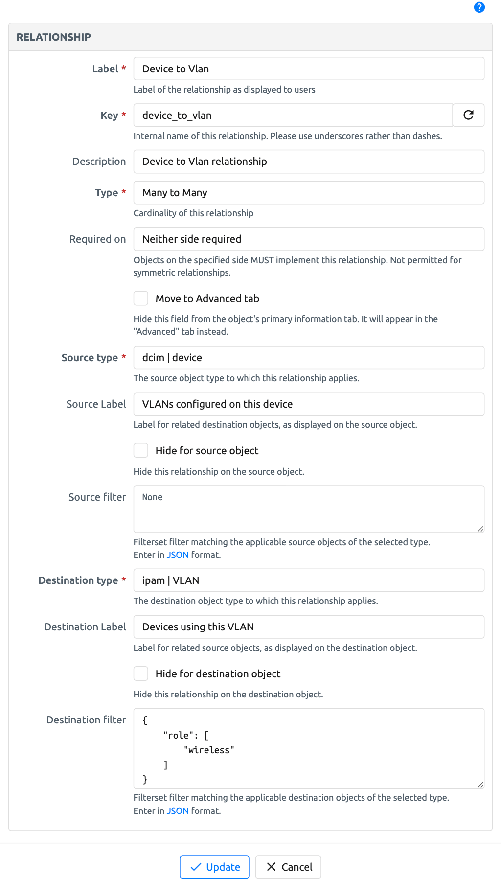 - Many-to-many - where both sides of the relationship connection can be connected to multiple objects. For example, VLANs can be connected to multiple devices and devices will have multiple VLANs.