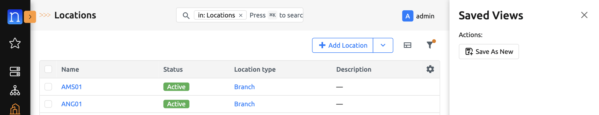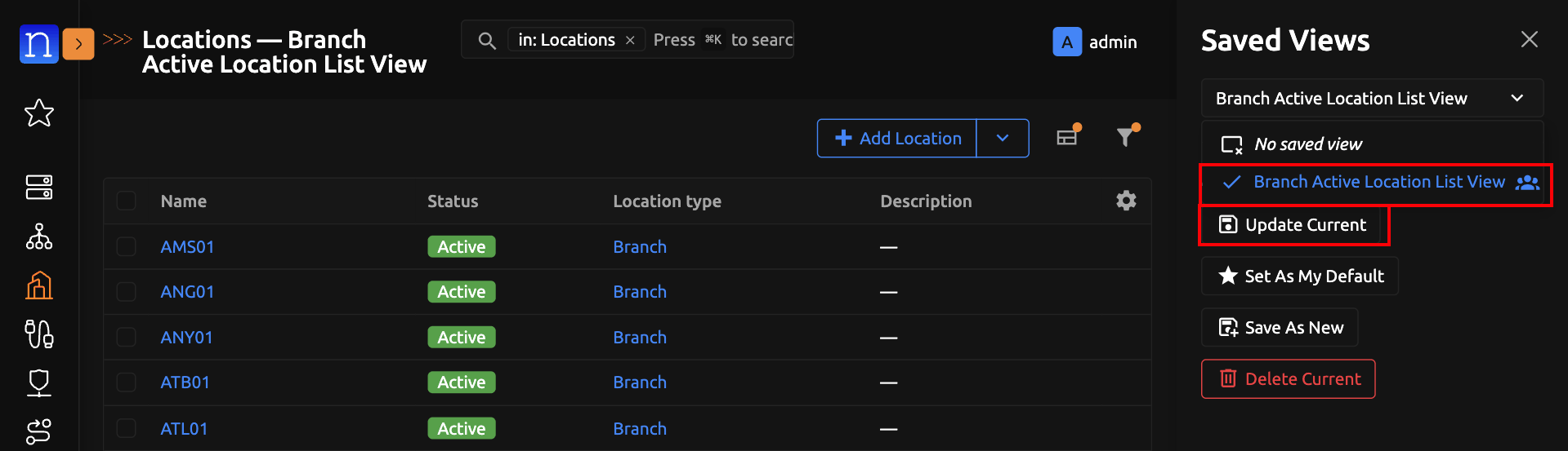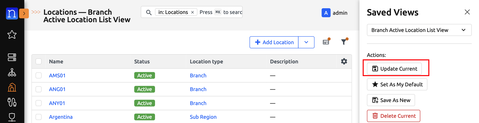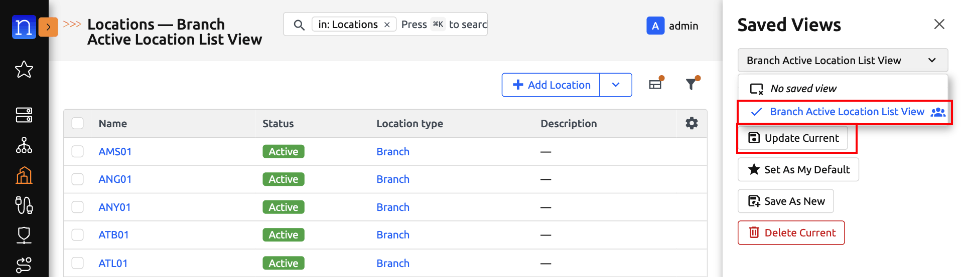 Navigate to any saved-view-supported model's list view. (We will use Location List View for the purpose of this guide)