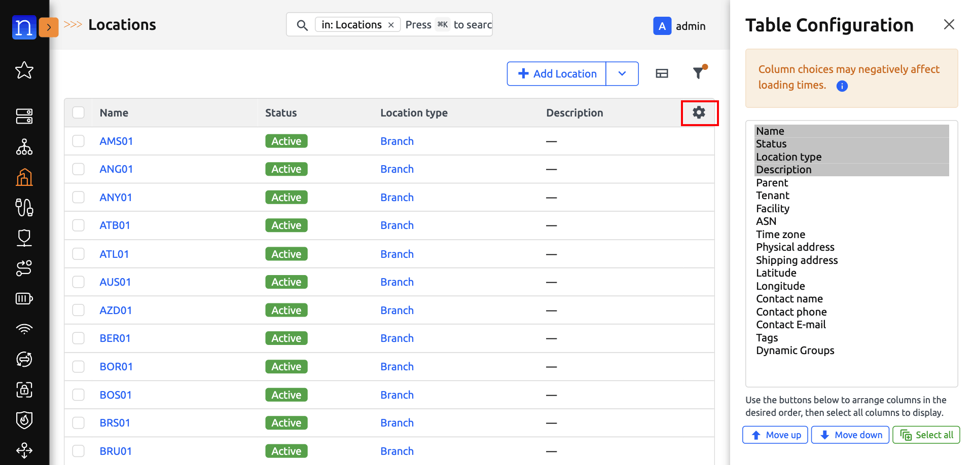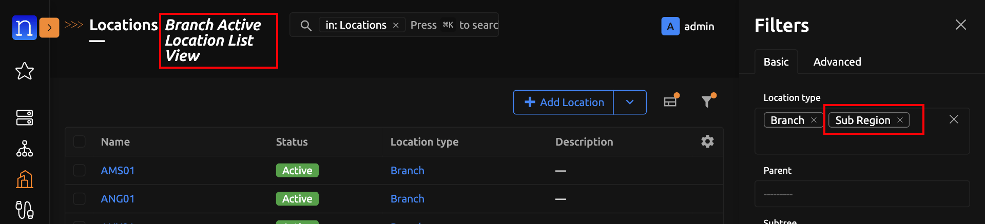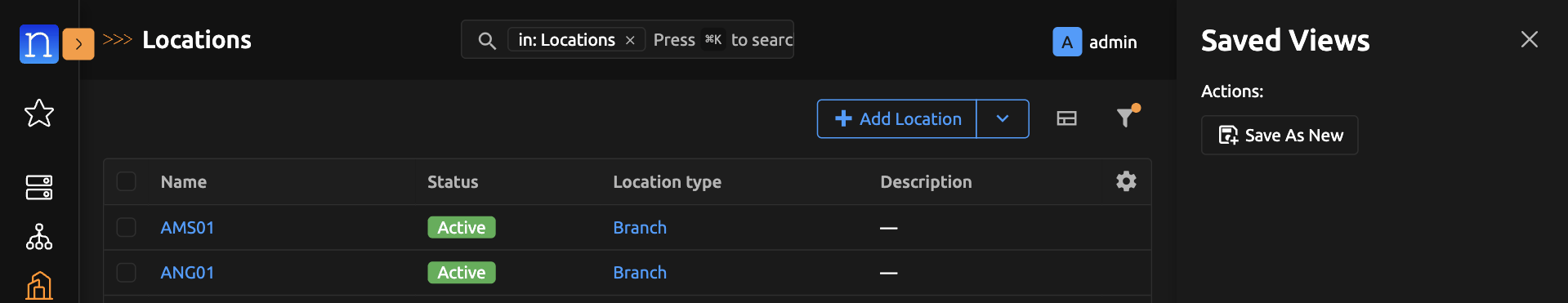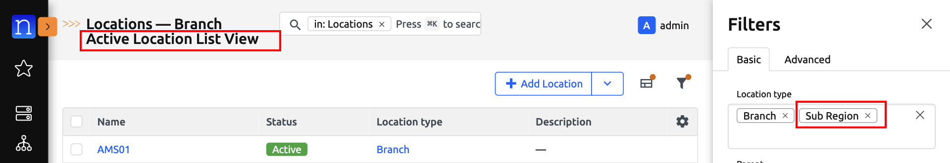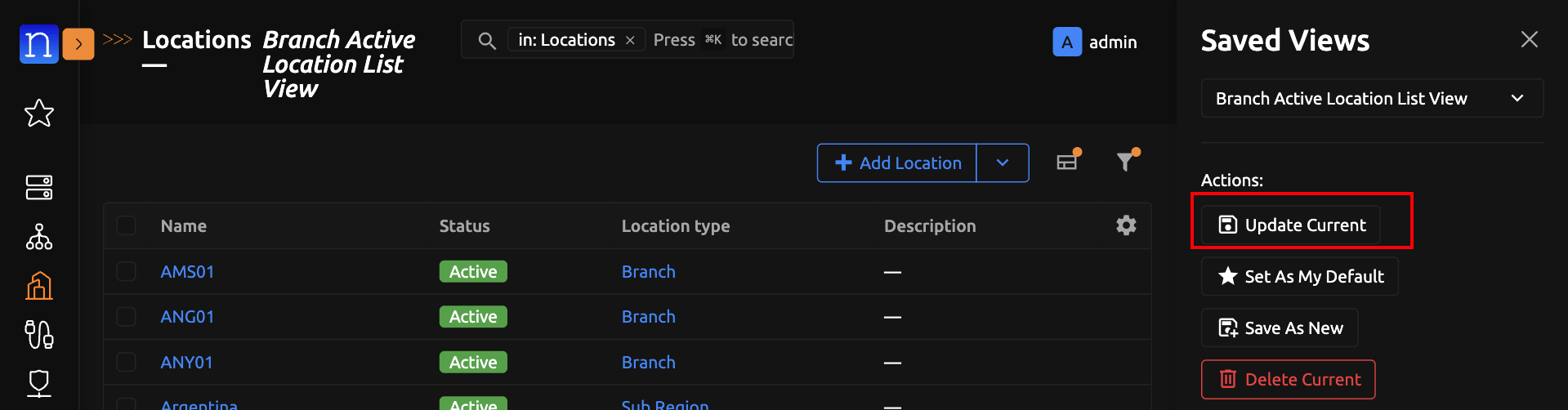 Navigate to any saved-view-supported model's list view. (We will use Location List View for the purpose of this guide)