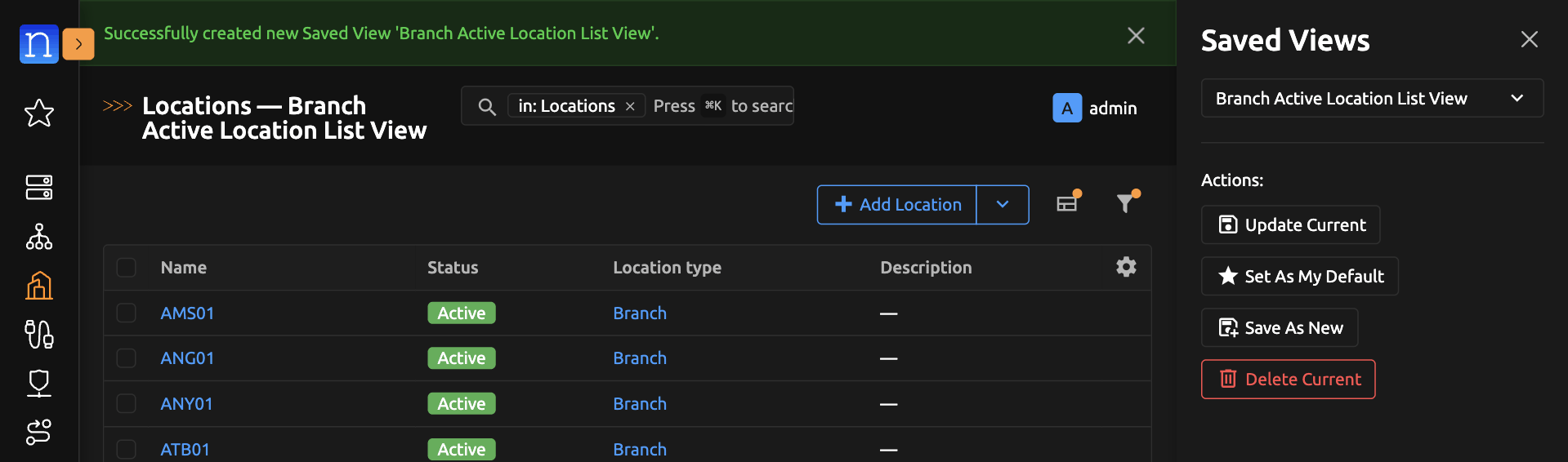 Click the "Save" button on the modal and the browser should take you to the new Saved View. Note the success banner on top of the page stating "Successfully created new Saved View Branch Active Location List View". Note that the current Saved View name also appeared in the page heading. This is an indicator that you are currently viewing a Saved View.
