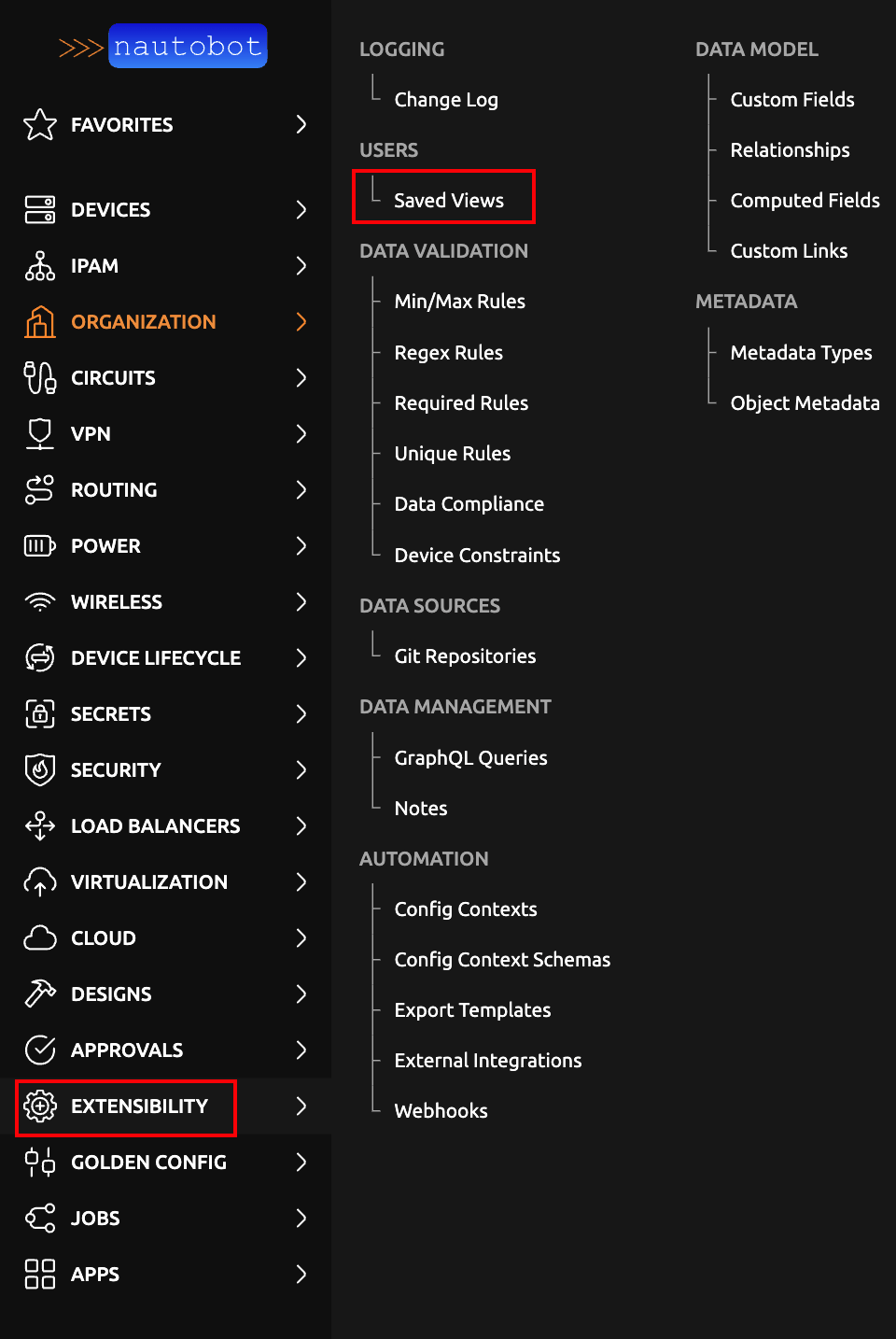 Additionally, if you have the extras:view_savedview object permission (or are a superuser), you can view a table of all Saved Views created by any user for any list view, accessible from the navigation menu under "Extensibility -> Saved Views":