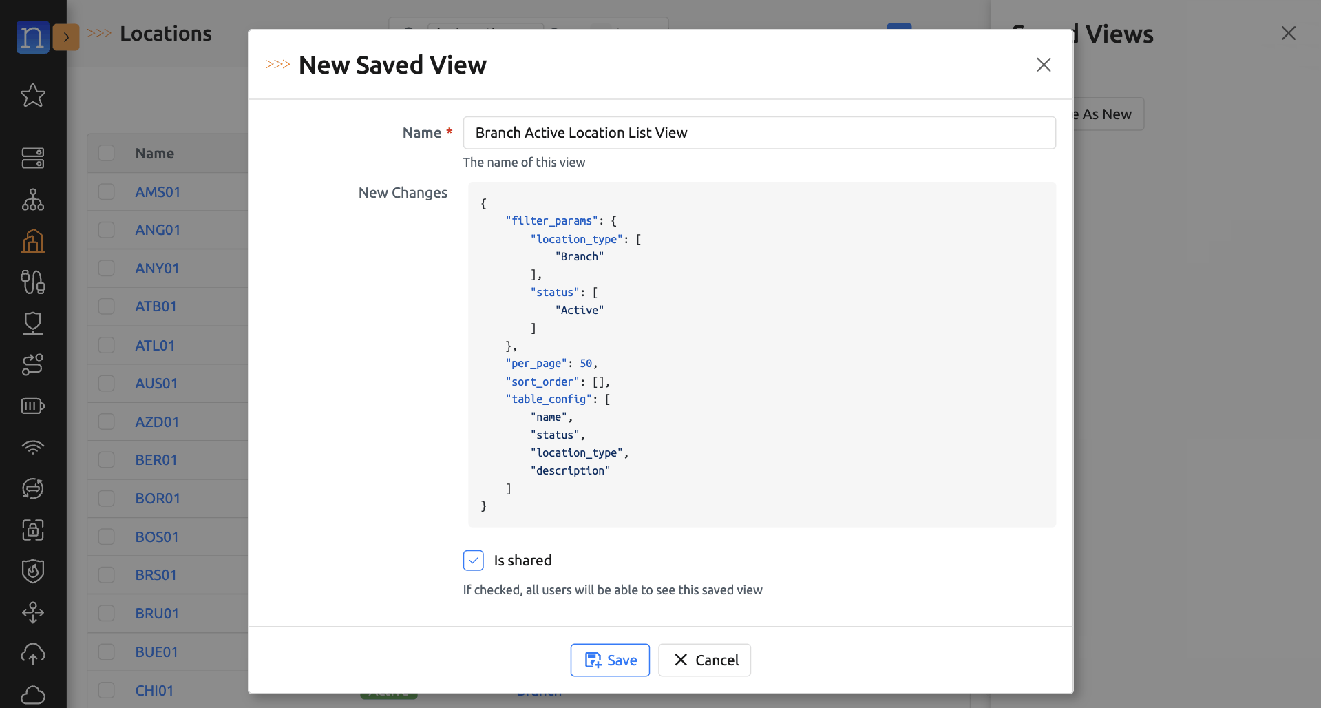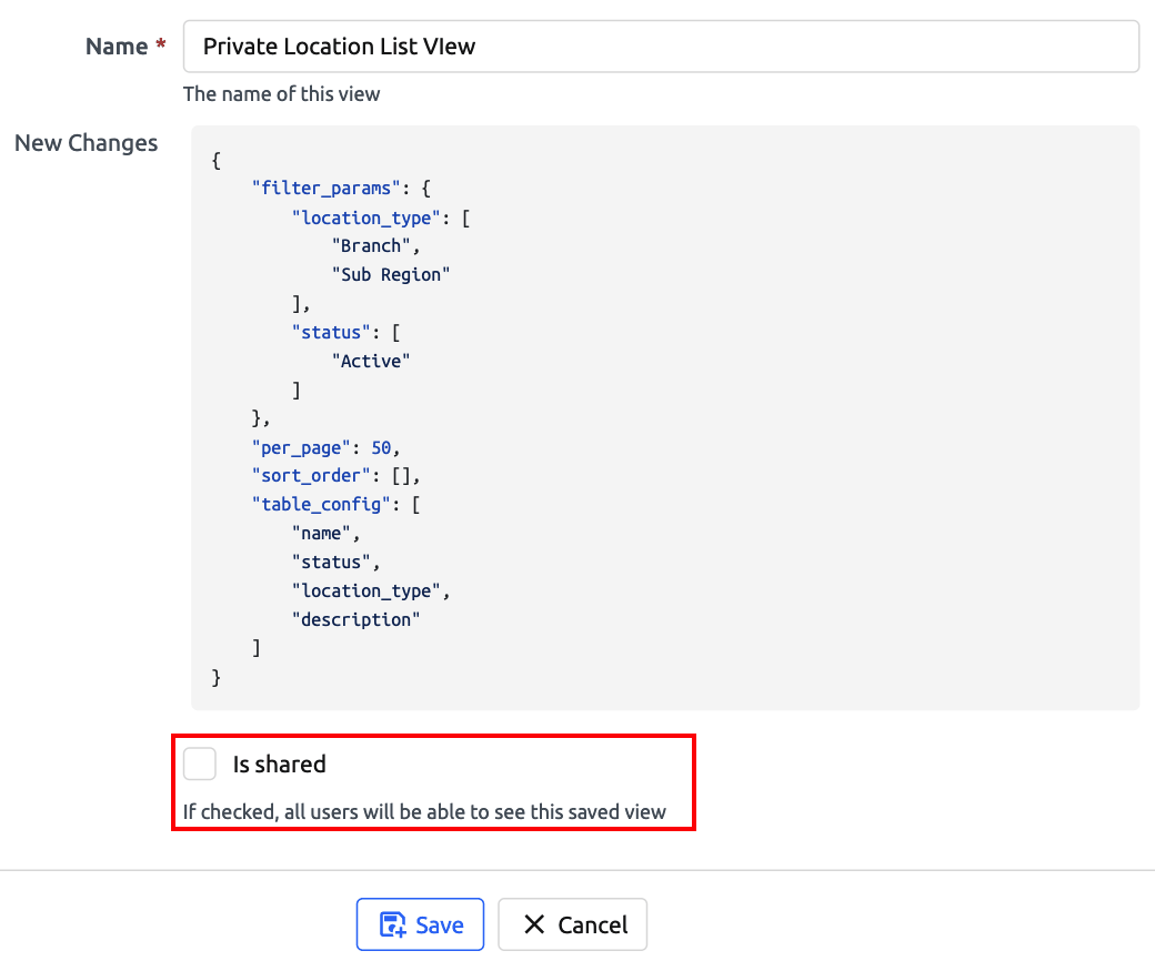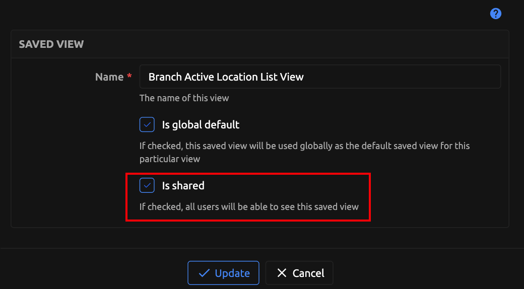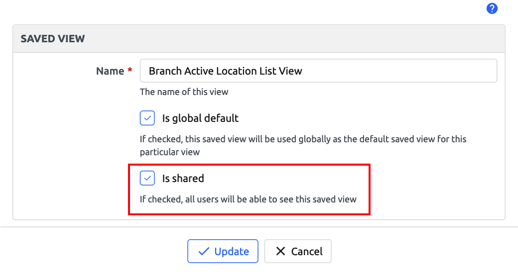 In this example, we will name this new Saved View "Branch Active Location List View" and make this view public (shared with other users).