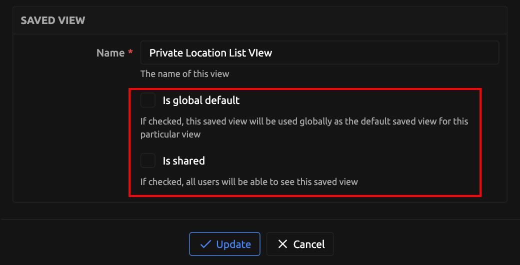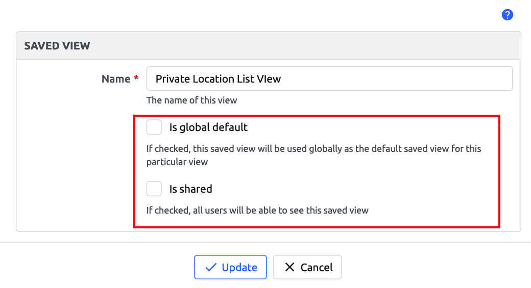 Clicking on the edit button will direct you to a standard edit view where you can edit the name, is_shared and is_global_default attributes of the current Saved View.