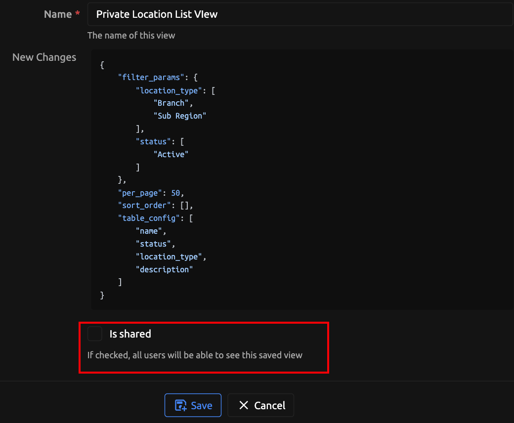 The is_shared attribute dictates whether a Saved View will be made available for other users to select. The is_global_default attribute (which may be set on a single Saved View per list view) makes this Saved View the default for all users of the system unless they specifically set their own default view (more on this below).
