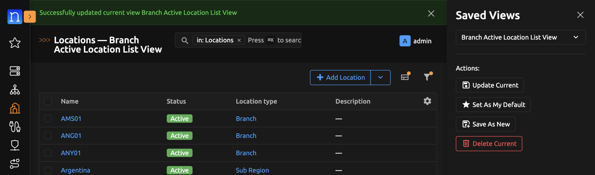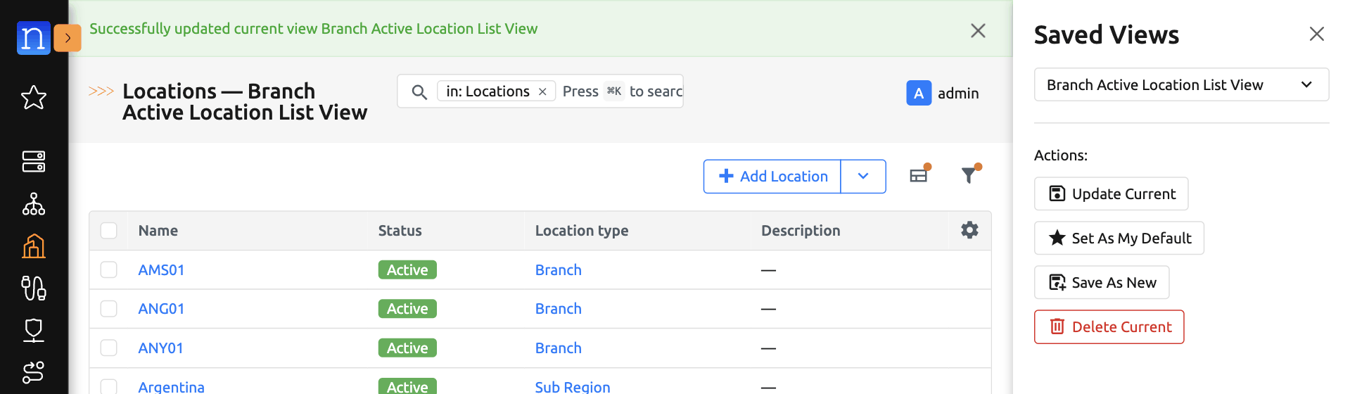 Clicking on that option will set the current Saved View as your default view for this object list view. The page should refresh with a success message. Now whenever you access the Location list view, this Saved View will automatically be applied to it.